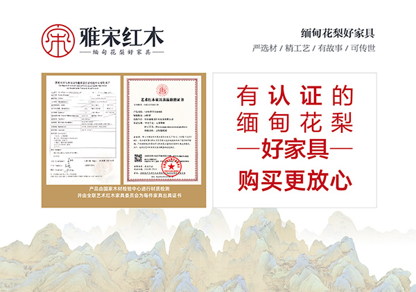 正規(guī)的產(chǎn)品在價(jià)格簽、合格證、明示卡等顯要位置注明材質(zhì)的中文學(xué)名,如果連最起碼的名稱都不能準(zhǔn)確標(biāo)注,那這套產(chǎn)品您就要慎重了。雅宋紅木每一套緬甸花梨家具均由國家木材與木制品檢測中心檢測并出具真品證書,每套產(chǎn)品都有它的產(chǎn)品合格證、產(chǎn)品質(zhì)量明示卡,以及真品證書。