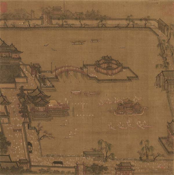 頭戴花枝,涌向皇家園林“金明池”的游人絡(luò)繹不絕。